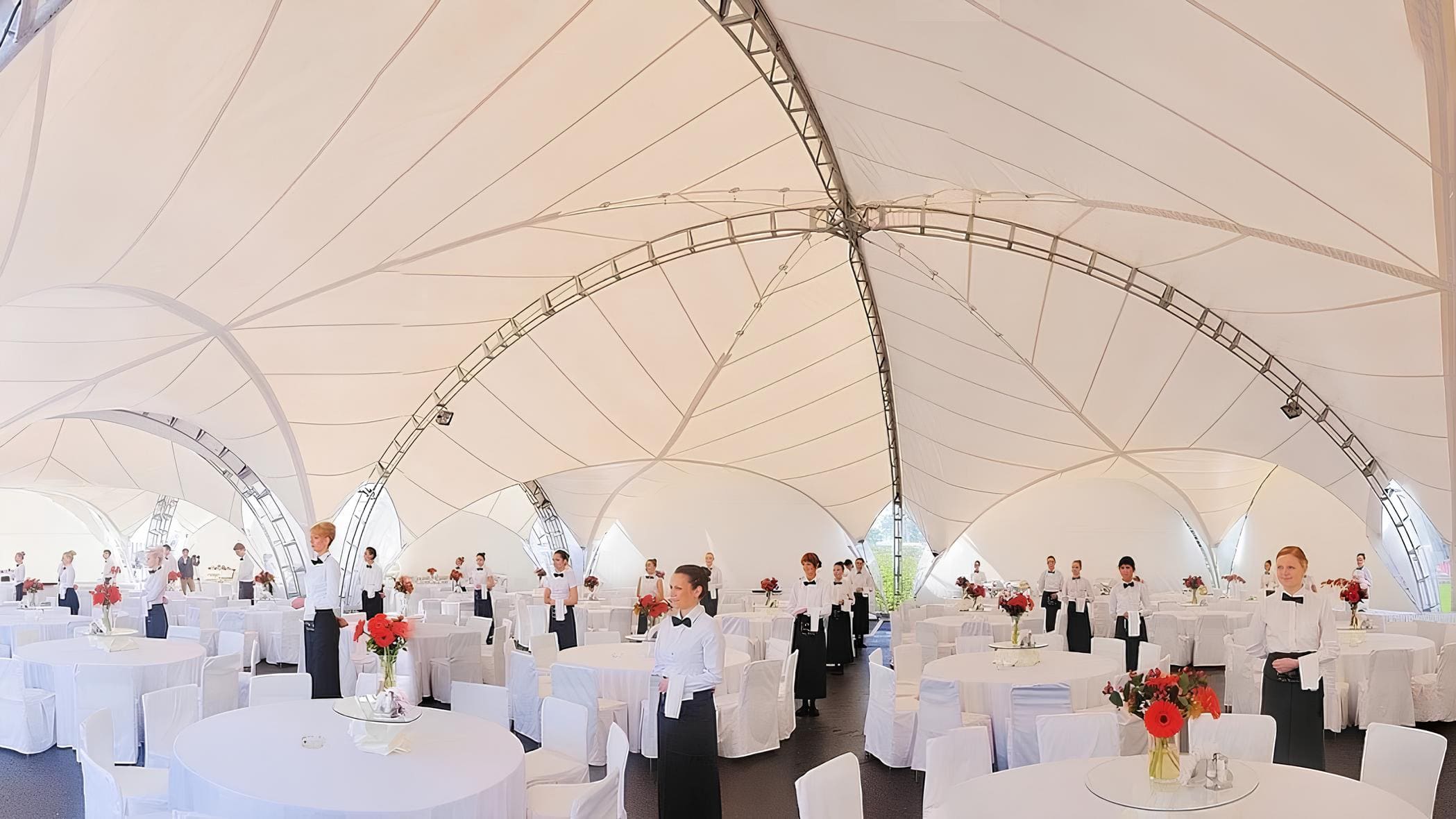 An arched catering tent offers a clear-span interior with no columns, making it easy to organize serving stations, bars, guest seating, and staff aisles. Its fast installation, wind resistance, and modular design allow you to scale the space to your required capacity.