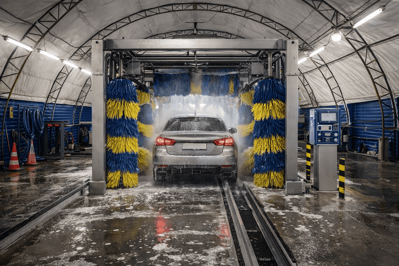 Fabric hangars are an ideal solution for establishing a professional car wash. Their vertical sidewalls allow neat installation of water and electrical lines, foam generators, control panels, lighting, and sectional doors. The layout supports an efficient workflow: vehicle entry, wash bays, drying, and exit zones, with optional spaces for customer waiting or storage of chemicals and equipment. This type of structure is especially suited for setups requiring wide doors, wall-mounted equipment, organized utility routing, and a “box-style” car wash layout with a clear and predictable process.